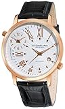 Eine exquisite Vorstoß in elegante Dual-Zeitmessung mit Farbtupfer, der Stuhrling Original Männer Polaris Schweizer Quarz Datum und Dual Time Zone Black Watch elegant verbindet überlegene Bewegung und bequeme Funktionalität. Dieser bemerkenswerte Zeitmesser beginnt mit einem runden 44mm rose vergoldet Edelstahlgehäuse mit einer festen Lünette und einem strukturierten Krone. Diese Elemente sind um einen eleganten silbernen Zifferblatt, das durch eine Krysterna Kristall geschützt und verfügt über Dual Zeitmessung Fähigkeit mit Rose